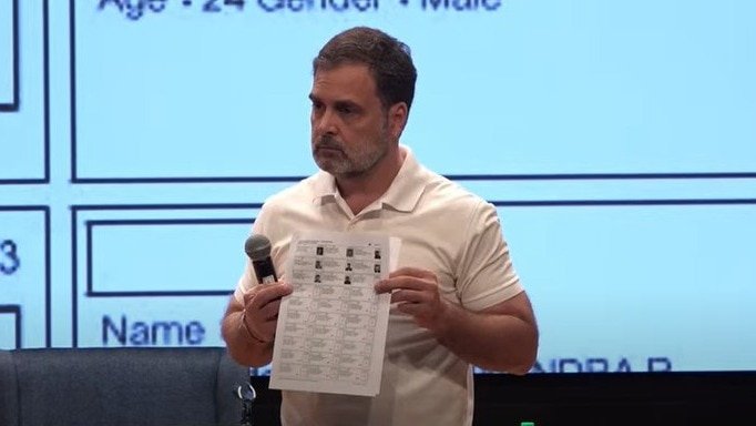 O líder do Congresso, Rahul Gandhi, deu um exemplo de eleitor chamado Tech Raj Sapkota. O nome do pai do pai é Dfogadf. O número de sua casa é 0. O número épico deles é SVF8249344.