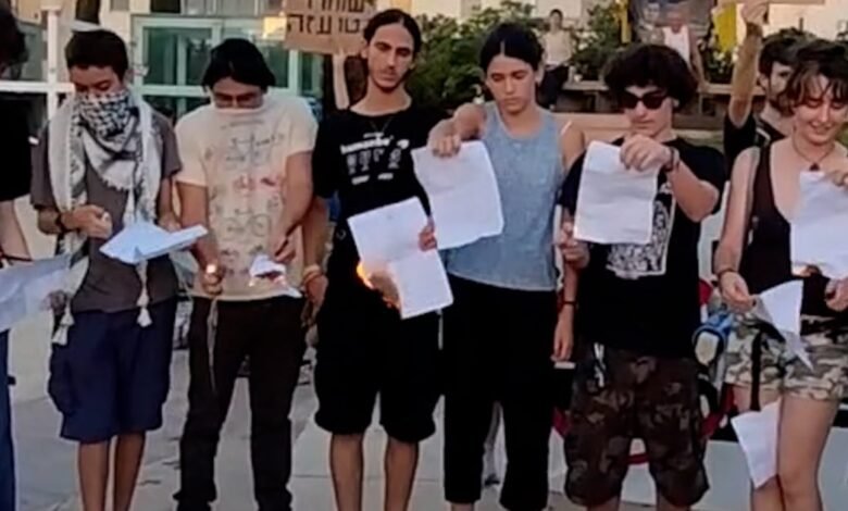 Os adolescentes israelenses queimam documentos militares em protesto pela guerra de Gaza