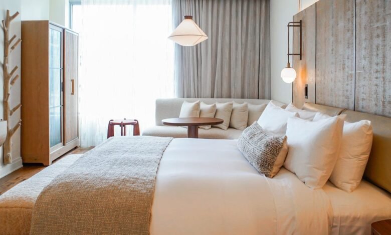 “O hotel se baseia na beleza crua do noroeste do Pacífico, com madeira recuperada, pedra natural, arte inspirada em musgo e móveis de ponta ao vivo tecidos em todo o design”, disse Brandenberg.