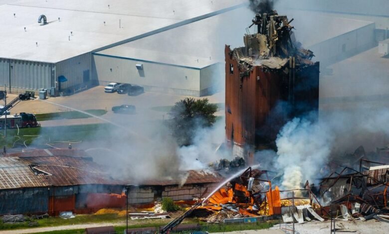 A explosão por volta da tarde na terça -feira rasgou o topo da torre alta da fábrica e expôs o concreto distorcido e o armamento, enquanto as paredes de metal e o teto do edifício abaixo foram desabadas e abertas. Spellerberg disse que as equipes estavam avaliando se toda a instalação havia desmoronado.