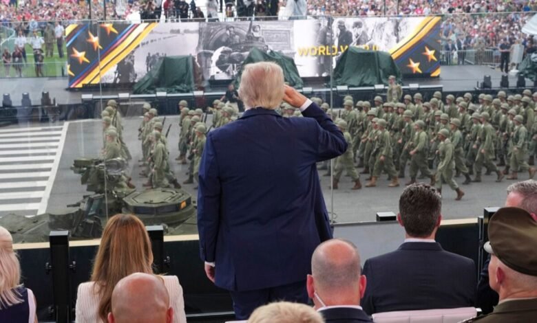 Durante o desfile, o que coincidiu com o 79º aniversário de TrumpSentou -se em um Tribune especial no sul da Casa Branca para ver a implantação do poder militar dos EUA, que começou cedo e se moveu rapidamente, enquanto uma ligeira chuva caiu e nuvens escuras cobriam o monumento a Washington.