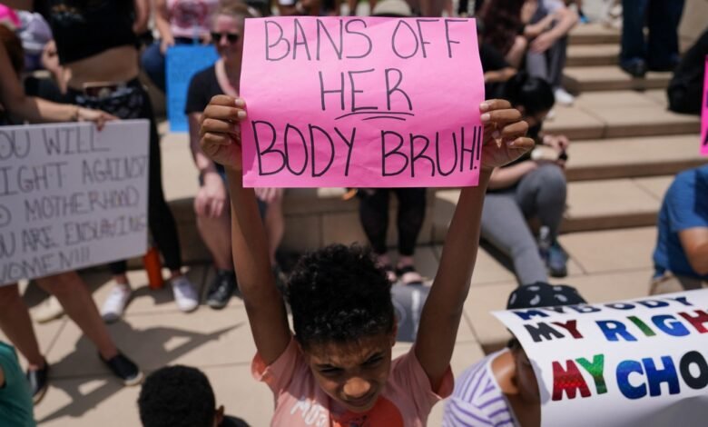 Um garoto mantém uma placa lendo “proíbe seu corpo Bruh” em uma manifestação fora do Capitólio do Estado em apoio aos direitos do aborto em Atlanta, Geórgia, em 14 de maio de 2022.