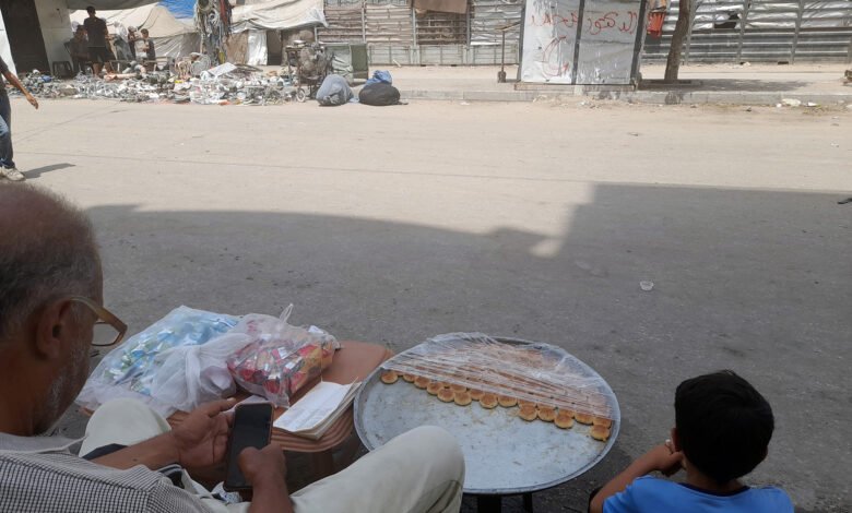 Gaza- Na calçada em frente à sua farmácia, que ele montou entre as áreas destruídas em Cidade de GazaO Dr. Mohamed Mansour fica ao lado de seu filho, que oferece pedaços de doces e bolachas à venda.