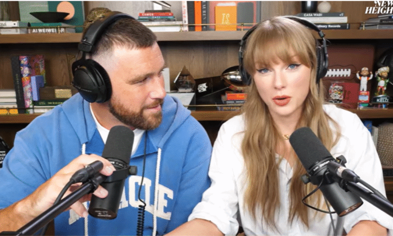 Travis Kelce olha para Taylor Swift durante o episódio de quarta -feira de Novas alturasO podcast que ele coanche com seu irmão Jason Kelce.