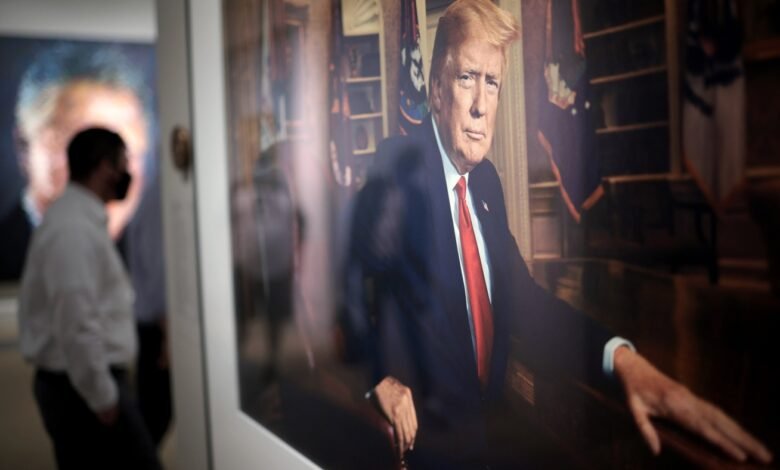 Os clientes veem um retrato do presidente Trump na exposição dos presidentes da América na Galeria Nacional de Retratos em 14 de maio de 2021 em Washington, DC.