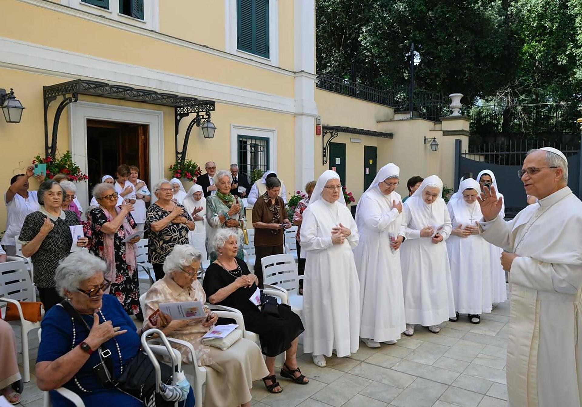 Leo Xiv cumprimenta a equipe de residência de Castel Gandolfo.