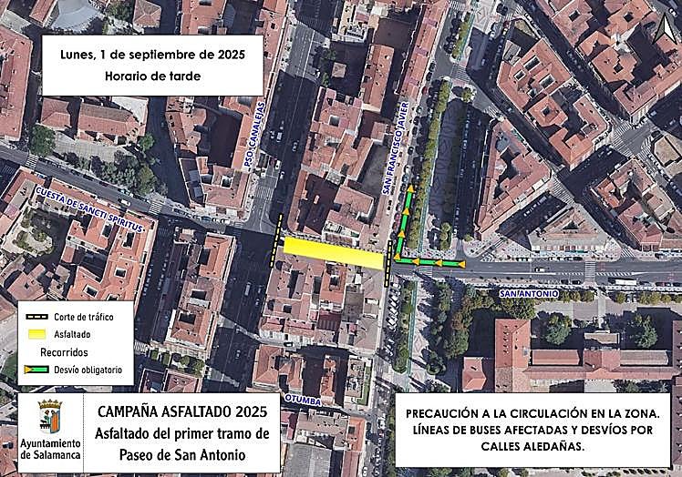 À tarde, El Corte ocorrerá no Paseo de San Antonio, entre o Paseo de Canalejas e a rua São Francisco Javier, onde a circulação será desviada para continuar ao longo da rua Padilla para Canalejas, afetando intermediários 4, 8 e 12 do ônibus. Os trabalhos de asfalas serão realizados alternadamente em cada sentido de circulação do Paseo de San Antonio para reduzir o inconveniente na circulação de veículos.