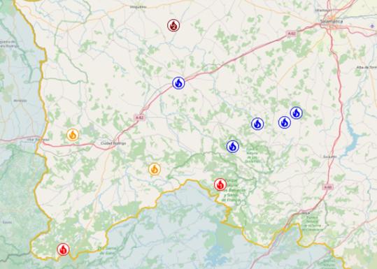 Localização dos cinco incêndios ativos em Salamanca neste domingo e os controlados.
