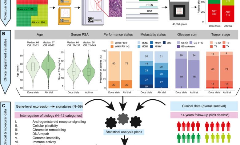 O estudo consistiu em 1.523 pacientes admitidos em testes de fase III estampados, que foram diagnosticados. Câncer de próstata avançado E começou o tratamento com terapia com depressão de andrógenos (ADT), que bloqueia hormônios masculinos, como a testosterona, que podem executar o desenvolvimento de câncer de próstata. Os testes de debandada testaram a vantagem adicional de adicionar abiratona ou dokaxel à ADT e os pacientes do estudo foram seguidos entre 14 anos.