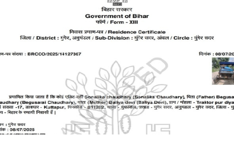 Uma grande negligência do escritório de Munger District de Munger veio à tona. Em um certificado de residência emitido em 8 de julho daqui, uma foto de um trator Sonalika foi colada em vez da foto do candidato. Não apenas isso, o nome do candidato foi registrado ‘Sonalika Kumari’, nome do pai ‘Begusarai Chaudhary’, nome da mãe ‘Ballia Devi’ e Endereço ‘Village – Village – Village – Tractorpur Diara, Ward – 17, Post Office – Dutapur, Código Pin – 811202, Estação policial e Block – Mufassil.