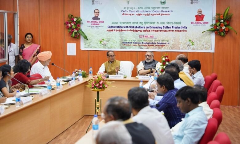 Para aumentar a produção e a produtividade do algodão no país, houve uma grandeza em Coimbatore na sexta -feira. O ministro da Agricultura e dos Agricultores da União, Shivraj Singh Chauhan, presidiu nesta reunião realizada no Instituto de Criação da Cana -de -Açúcar, Coimbatore, Icar. A reunião contou com a presença do ministro têxtil da União, Giriraj Singh, ministro da Agricultura de Haryana, Shyam Singh Rana e Icar, representantes de vários estados, cientistas, agricultores e empreendedores. O objetivo da reunião foi fazer um roteiro em uma ‘missão de algodão’ coordenada, entendendo os desafios da área de algodão. Chauhan disse que chamamos o governo de Tamil Nadu e seu ministro com respeito na reunião, mas eles não vieram. O ministro da Agricultura da União disse que, seja obra de agricultores ou qualquer questão de interesse do país, o país está no topo para nós.