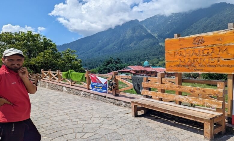 Após o posto, continuamos medindo um ao outro do mercado de Pahalgam por cerca de duas horas. No tempo comum, onde os ombros colidem com os ombros enquanto caminhavam, as estradas estavam desertas. Nos chamando de lojistas e vendedores ambulantes. Um desses atacadistas Murtaza colide conosco.