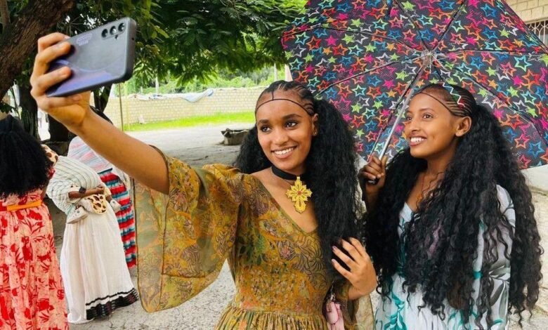 As mulheres jovens comemoram a Virgem Maria no festival de Ashenda de séculos, na cidade de Mekelle, no norte da Etiópia, no domingo. (Girmay Gebru/BBC)