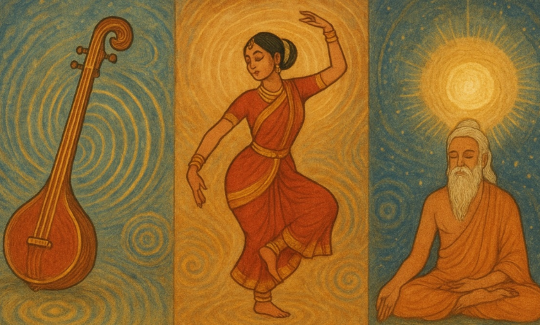 A música clássica indiana faz parte das belas artes. A belas artes inclui cinco artes, poesia, pintura, escultura e arquitetura. Entre eles, a música cantando, tocar e dançar é uma confluência das três artes. No livro antigo chamado Sangeet Ratna, foi dito que ‘músicas e danças, Tríade: Sangeet Muchyate’. Ou seja, a música é a música de cantar e dançar juntos.