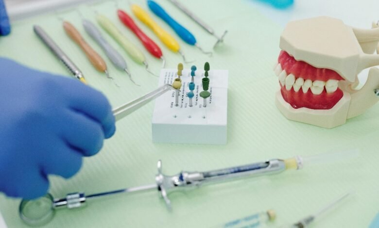 Várias ferramentas e ingredientes relacionados à odontologia recuperada
