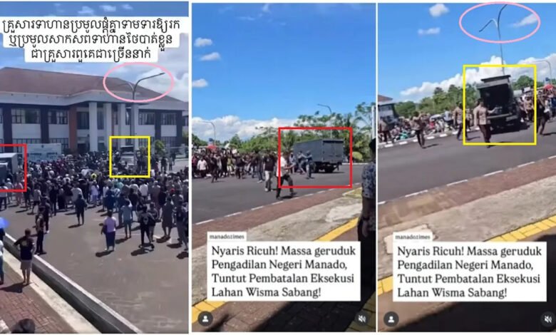 Após um cessar-fogo entre Bangkok e Phnom Penh, que terminou cinco dias de confrontos mortais de fronteira, um vídeo de uma manifestação na Indonésia foi falsamente compartilhado em cargos de língua Khmer, alegando que mostrou que os manifestantes tailandes exigindo seu governo recuperar os corpos de soldados mortos no conflito. O clipe foi filmado do lado de fora do Tribunal Distrital de Manado, na província de North Sulawesi, na Indonésia, e mostra um protesto sobre uma apreensão de terras ordenadas pelo tribunal.