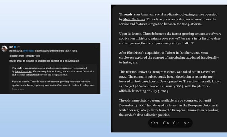 A Meta parece estar trabalhando em maneiras de os usuários de threads compartilharem a escrita longa em uma única postagem. Vários usuários têm relatado Ver um novo recurso “Anexar texto” no serviço, que lhes permite incorporar grandes pedaços de texto em uma única postagem.