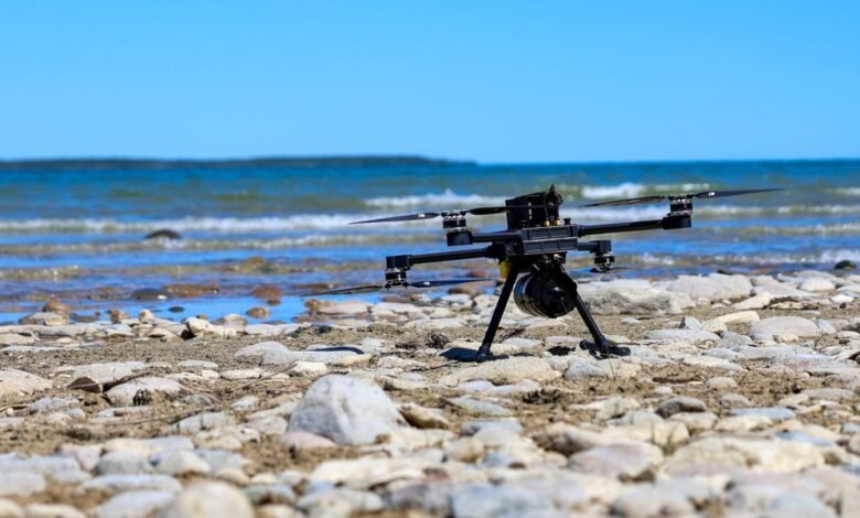 Fotos postadas pela Guarda Nacional do Michigan, que foram vistas e relatadas por A zona de guerraMostre o que parece um drone de fibra óptica sentado em uma praia rochosa. O pequeno e preto o drone de quadcopter está equipado com um carretel para um cabo de fibra óptica.