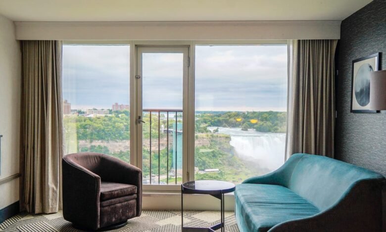 O Sheraton Fallsview, parte do Marriott Bonvoy Hotel Coleção, é um hotel de quatro estrelas. Os quartos variam de uma visão interior a partir de US $ 150 a quartos e suítes com vistas das Cataratas, que custam entre US $ 190 e US $ 425, de acordo com uma pesquisa recente de reservas com um mês de antecedência.
