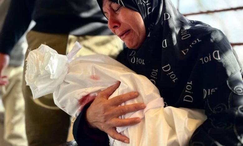 As pessoas carregam o corpo de um garoto palestino, que perdeu a vida depois de ataques israelenses visando os palestinos que vivem em casas e tendas improvisadas, no Hospital Nasser. Imagens doaa el-Baz/APA via Zuma Press Wire/DPA