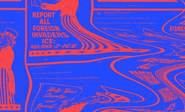 Na quarta -feira, A Casa Branca e o Departamento de Segurança Interna compartilharam um Pôster de propaganda em contas oficiais em X e Instagram. Apresentava o tio Sam pedindo aos americanos que “relatassem todos os invasores estrangeiros”, chamando a linha de imigração e alfândega da linha de aplicação. A imagem foi divulgada pela primeira vez por um nacionalista branco que recentemente defendeu o uso da palavra n e compartilhou material de uma conta explicitamente neonazista, de acordo com uma revisão da atividade de mídia social.