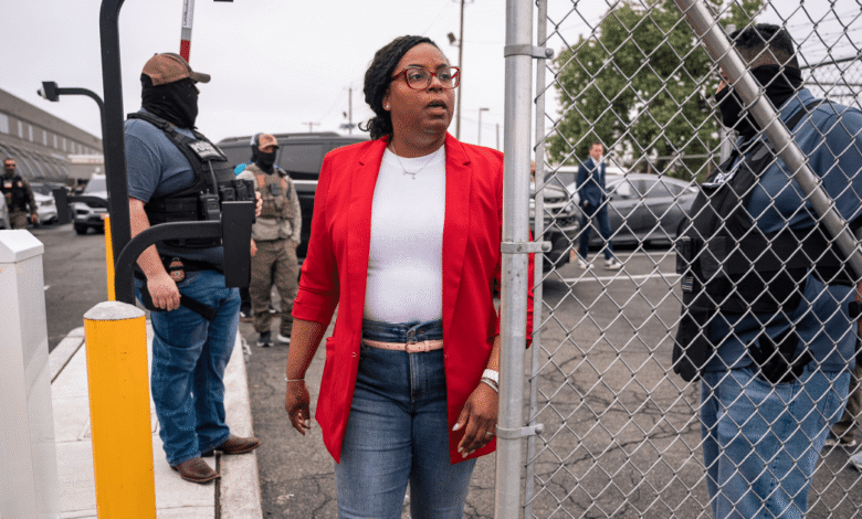 A congressista Lamonica McIver, DN.J., sai dos terrenos em Delaney Hall, um centro de detenção de gelo, 9 de maio em Newark, NJAngelina Katsanis/Ap