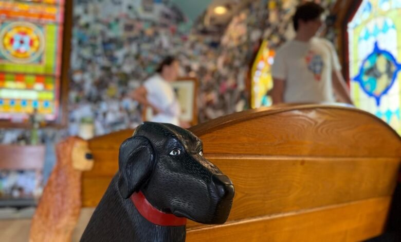 Escultura, impressão e móveis são exibidos em buzina na exposição e espalhados por todo o parque, inclusive dentro da igreja que se construiu. Com o Black Labs e Golden Retrievers esculpidos nas extremidades de cada biografia e fotos de seu cachorro, Sally, em janelas de vidro coloridas, seu amor por cães é limpo em todos os detalhes.