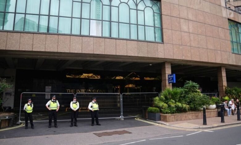 Uma polícia foi vista por cerca de 15 policiais do lado de fora da entrada da casa de Londres na manhã de quarta -feira, incluindo pelo menos quatro caminhões com policiais nas ruas próximas.