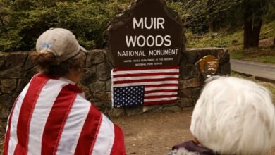 Os manifestantes colocaram uma bandeira nos EUA invertida, um símbolo de angústia, no Monumento Nacional Muir Woods, no Condado de…