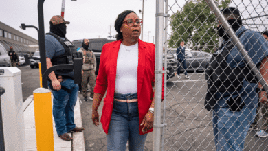 A congressista Lamonica McIver, DN.J., sai dos terrenos em Delaney Hall, um centro de detenção de gelo, 9 de maio…