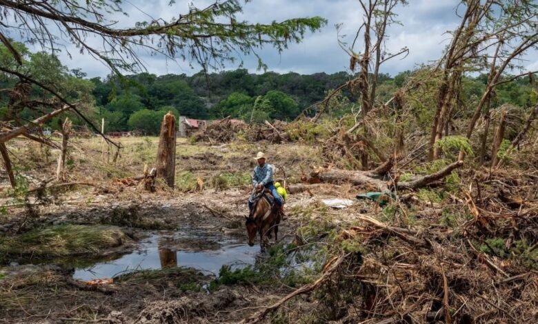 Um bombeiro de bombeiros em uma patrulha de busca e resgate em Hunt, Texas, 12 de julho de 2025.Brandon Bell/Getty Images via Grist
