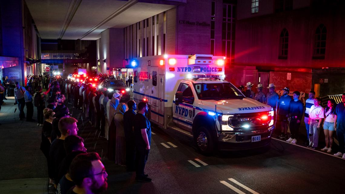Seu corpo estava envolvido na bandeira da polícia de Nova York, onde ele foi transferido do hospital para uma ambulância, com seus colegas oficiais prejudicando a atenção.