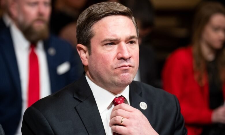 O procurador -geral do Missouri, Andrew Bailey, endireita sua gravata vermelha antes de uma audiência no Congresso.Bill Clark/CQ-Roll Call, Inc/Getty