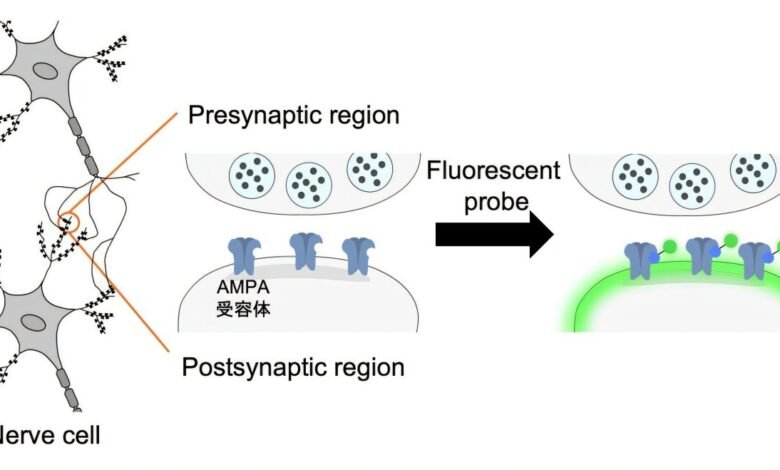 Visualização imediata do coletor com nossa verificação de fluorescência. Um diagrama que mostra que a sonda fluorescente pode imaginar os receptores AMPA nas sinapses por pulverização. Crédito: Progresso científico (2025). Dois: 10.1126/sciadv.adt6683