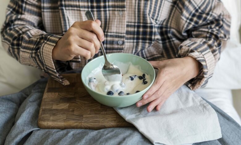 O iogurte grego é uma fonte de probióticos benéficos, apóia a digestão saudável e pode reduzir o gás ou a inflamação antes de dormir.