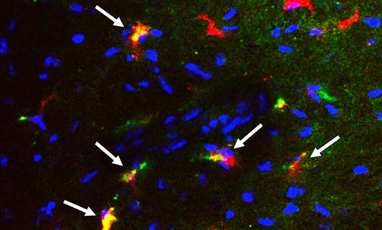 Os pesquisadores de medicina Washu mostraram em camundongos que, imediatamente após um ataque cardíaco, células imunes especiais (indicadas por setas brancas) são mobilizadas do baço ao coração para ajudar o cardíaco. Crédito: M. Amin Ismail/Washu Medicine