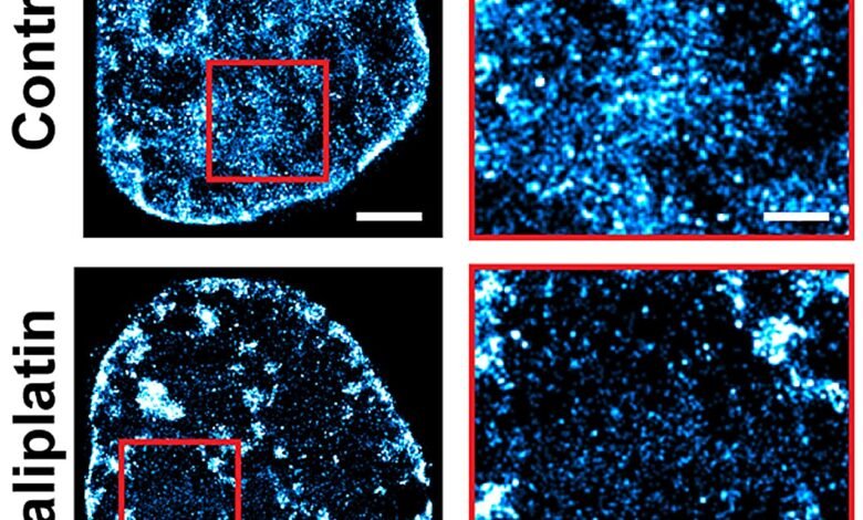 A linha superior é células cancerígenas não tratadas e a quimioterapia abaixo é tratada. A coluna esquerda é o núcleo inteiro, enquanto o lado direito é ampliado em uma parte do núcleo. As células não tratadas têm aglomerados grandes que se adaptam à embalagem de cromatina e as células tratadas com quimioterapia têm vários grupos que são muito pequenos em tamanho. As células quimioteciais têm mais domínios de embalagem e potencialmente mais áreas de superfície que são para melhorar a expressão gênica. Crédito: Wadim Backman Laboratory / Northwestern University