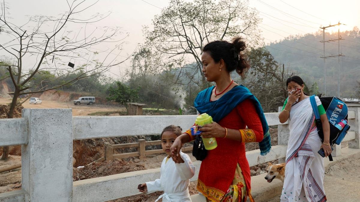 As pessoas andam em uma estrada dominada na cidade de Berniaat, Migalaya, 29 de março de 2025. Imagem de crédito: Reuters
