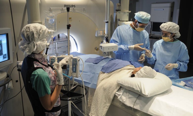 Institutos Nacionais de Trabalhadores de Saúde fornecem os serviços intervencionistas do paciente no Centro Clínico para os Institutos Nacionais de Condições Genéticas em 2008 (National Institutes of Health/CC BY-NC 2.0))